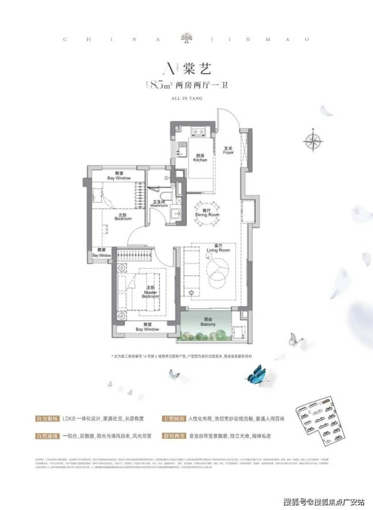 建面约105㎡3房2厅2卫,做到了三开间朝南+4个飘窗+双面阳台系统+主卧套房设计+270°转角飘窗,该户型的居住体验、舒适度、尺度感,是同级别产品所无法比拟的。