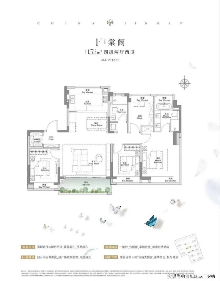 建面约117㎡3房2厅2卫,做到了3+1开间朝南+5阿个飘窗+主卧套房设计+270°转角飘窗,所有的尺度都有进一步提升。