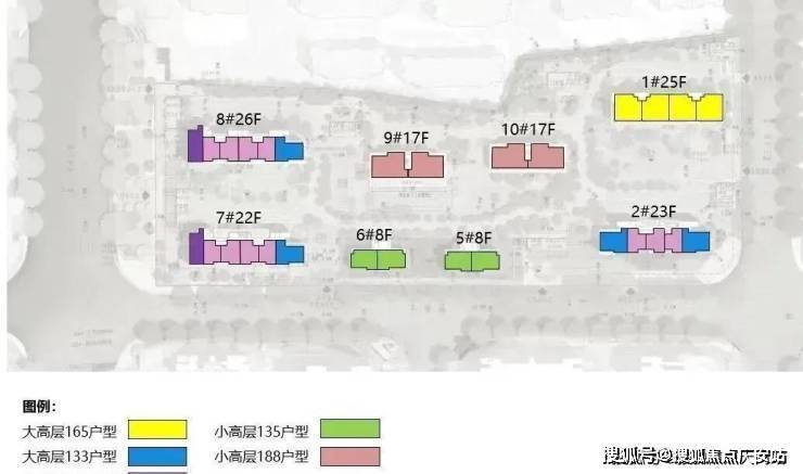 根据设计方案显示,该地块拟建2栋8F小高层住宅、6栋17-26F高层住宅以及若干社区配套用房;项目地面无车位,全人车分流,除5#、6#外,其余楼底层全架空,预计打造泛会所概念!