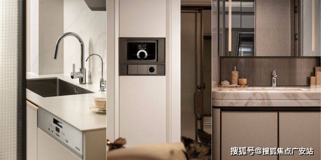 卫浴空间配备唯宝智能卫浴与高仪花洒系统,带来星级酒店般的舒适体验;厨房区域则搭载美诺4件套(燃气灶具、吸油烟机、烤箱、洗碗机)、博世冰箱等。同时,户型还引入华为全屋智能系统,实现家居生活的便捷操控;霍尼韦尔新风系统、日立/东芝空调地暖三大件也全部配齐,全方位保障居住的健康与舒适。