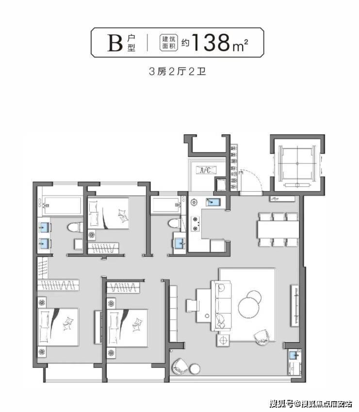138㎡三室两卫瞰景飘窗,空间利用率高约262万改善型功能分区