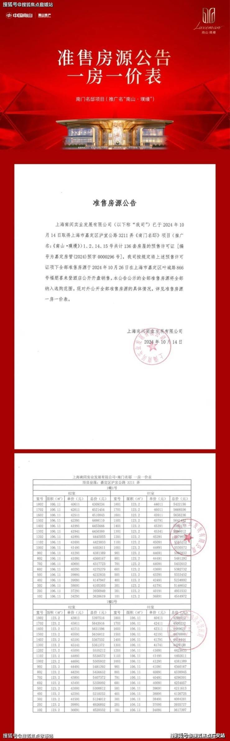 南山璞缦售楼处营销中心:400-8657-114☎去年10月24日,上海第三批次土拍中,南山以总价175602万元成交嘉定工业区南门社区JDC1-0801、JDC1-0802单元44-08地块,地块出让面积34703.9㎡,容积率2.3。溢价率0%,楼板价22000元/㎡,装修标准2000元/㎡,房地联动价46000元/㎡。