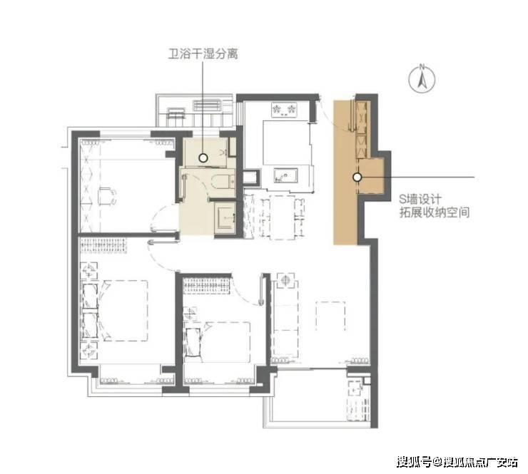 更值得一提的是建筑面积约89平方米户型“S墙创新设计”,为相邻两户创造出了额外的凹槽空间,扩展了收纳。将冰箱塞入这个凹槽,释放厨房的冰箱空间,延伸灶台面积,或者可以做岛台……让小户型不在受收纳空间的支配;