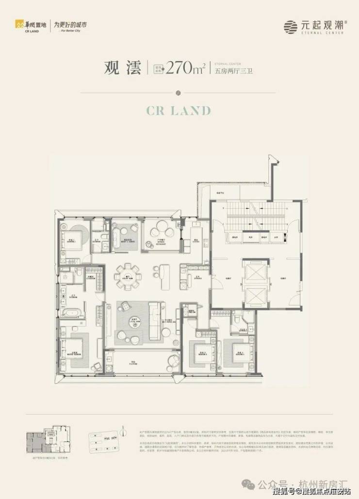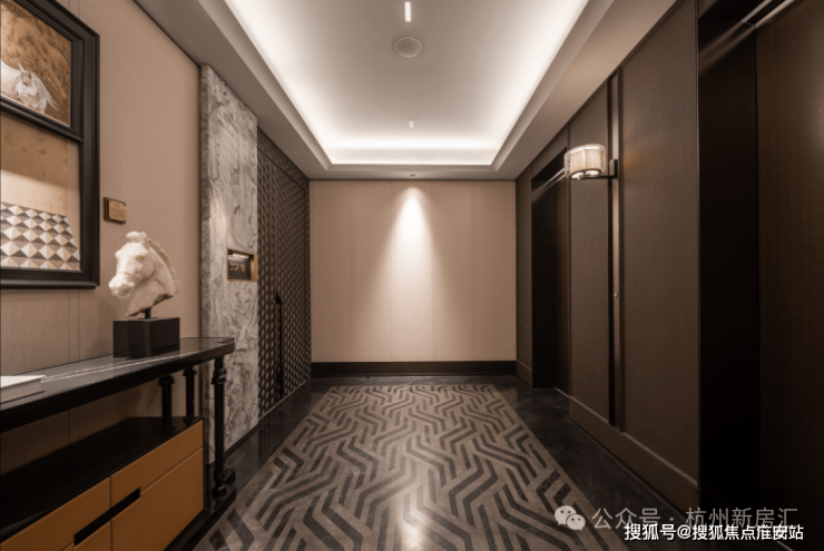 建面约270㎡五房南厅户型:有边厅和南厅两款:两梯两户+双开门贯通电梯,实际使用起来有近似“两梯一户”居住体验。巨大的电梯厅面积将近13㎡,精装奢石和木纹铝板。从尺度到装标,都冠绝杭州住宅领域。