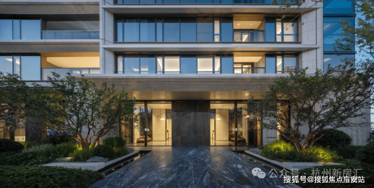 建筑立面上,源自罗伯特・斯特恩古典风格的现代转译,融入蒙迪里安格构手法,以质感石材、鎏金铝板与大面积玻璃的精妙组合,搭配独墅感框景序列,既彰显古典的厚重与尊崇,又兼具现代的简约与通透,成为城市天际线中一道独特的风景。