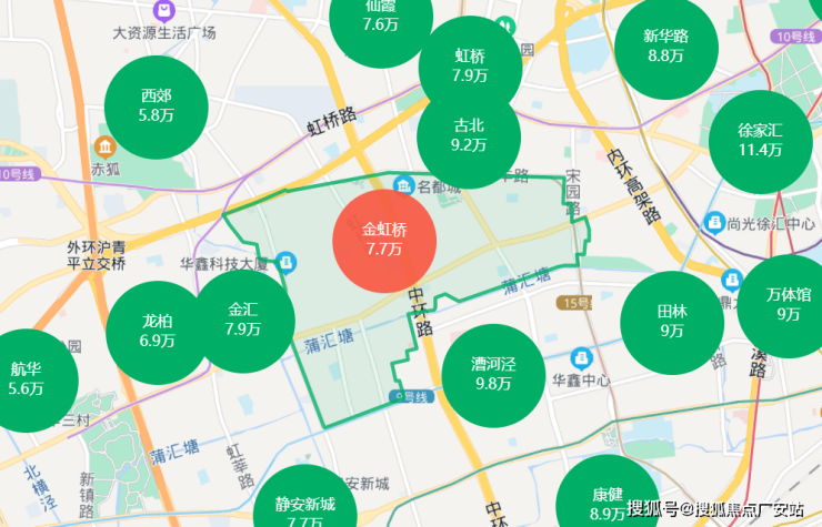 金虹桥地处闵行、徐汇和长宁3区交汇处,它的北面就是长宁天山板块,南面是漕河泾高新技术开发区,西面是上海风头正劲的大虹桥,东面则是徐汇田林和徐家汇,地理位置十分出色,如今区域内的豪宅代表古北壹号都能卖25万单价了!