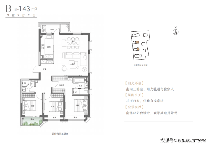 建面约143㎡3房产品,边厅户型,拥有超配北阳台空间,可作为家政空间使用,南向全明三卧室,通透舒适。
