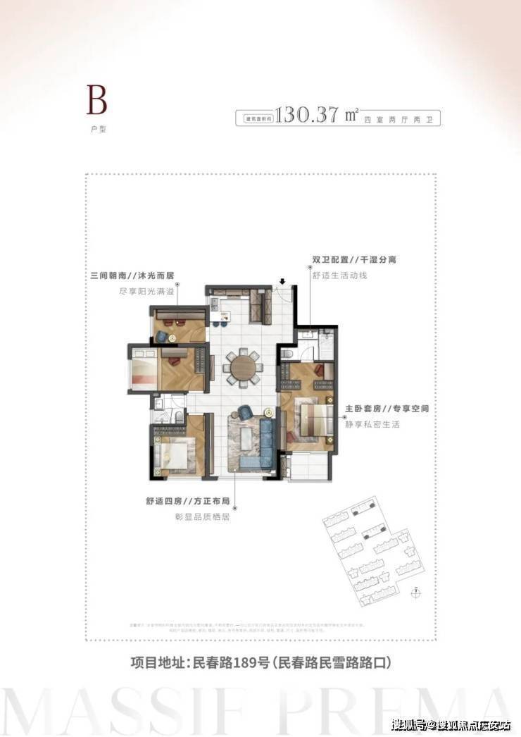 精致三房:合理设计,尽享灵动空间全明户型:通透采光,鲜氧清风相伴独立飘窗:三间卧室,饱览四季景观客餐通厅:双厅联通,双厅朗阔舒适面积约130.37㎡4室2厅2卫▼