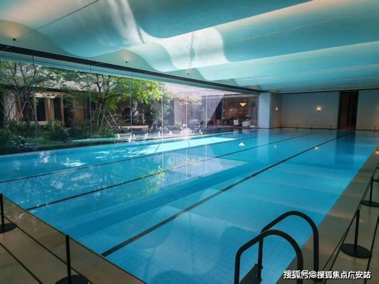 最后来看泳池。云邸玖章做了再升级。改为采用大尺度的落地玻璃拼接,约2.4米宽巨幅玻璃,且通过精致的玻璃交接细节处理增进室内外空间的融合,强调泳池的无界感,真正实现了无边泳池的效果、质的飞跃。