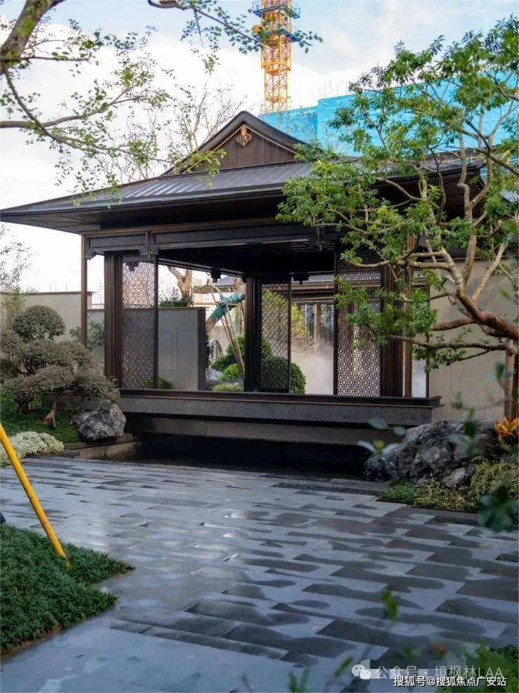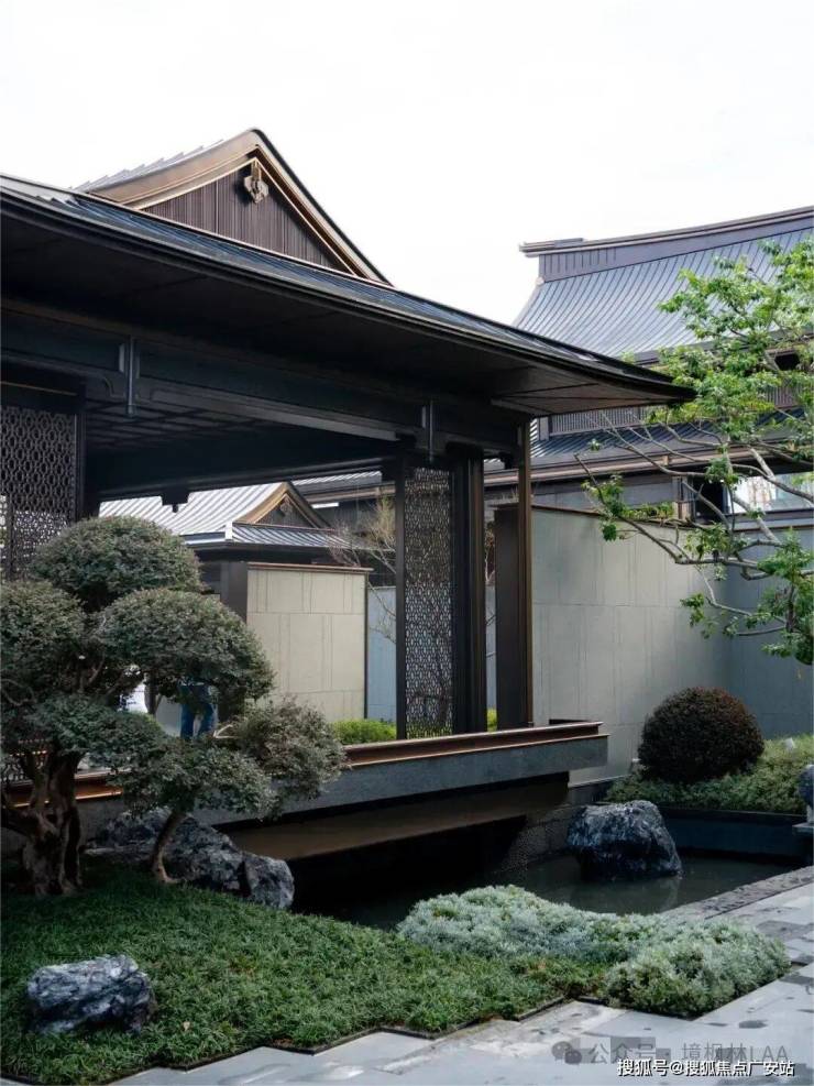 项目园林景观以宋韵文化为主题,精致的园林造景等元素展现东方美学大境。园林内搭配有亭、台、廊、桥、轩、榭等经典古建筑,采用榫卯、斗栱等传统建筑结构,水石相映,步移景异,营造出浓厚的文化氛围。