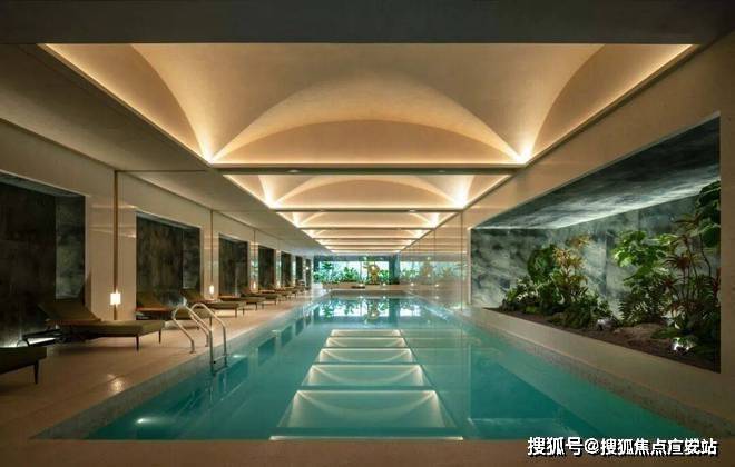 二层空间以艺术为脉络重构功能场景:专业餐酒吧搭载高端设备,化身社交艺术展厅;植物园泳池以“树影婆娑”为灵感,池底铺砌皮革面绿纹石材,营造都市秘境;女性友好健身房定制专属器械区,并配备补妆间、心理理疗室,融合健康管理与私密关怀。