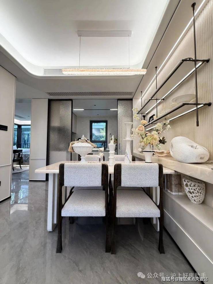 归家门厅设计为 弧形顶棚,非对称构图,圆润的形式提供给业主放松的情绪价值。可以说是处处体现人居的松弛感和舒适度。