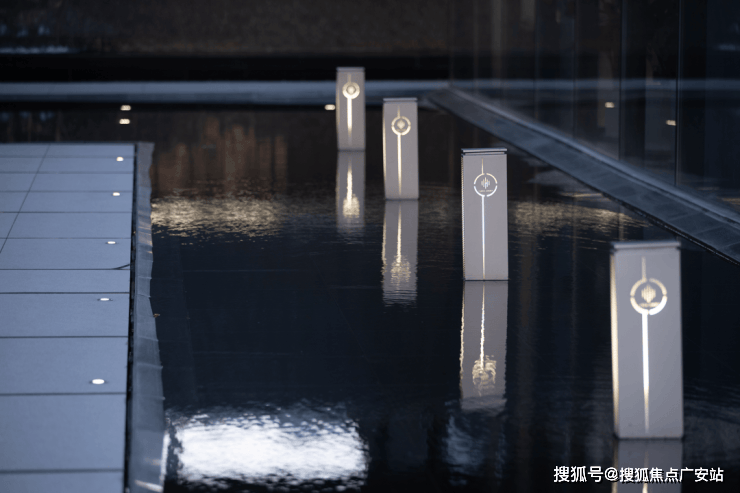 水面凸起的条形水台,线状排布了欢快的涌泉,以动衬静;引向精细雕琢的艺术品“鲲鹏之翼”,视线便随之追向了城市的边际,万家灯火,山脉绵延。