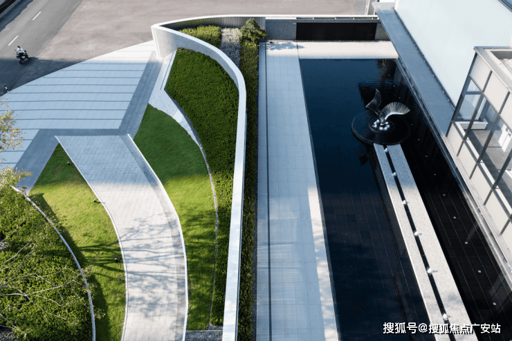 建筑地坪高出城市道路1.5m,天然的高差给“雕塑”创造了条件,设计以地景为山,园路为谷,犹如山江相生的地理风貌,起伏跃动。