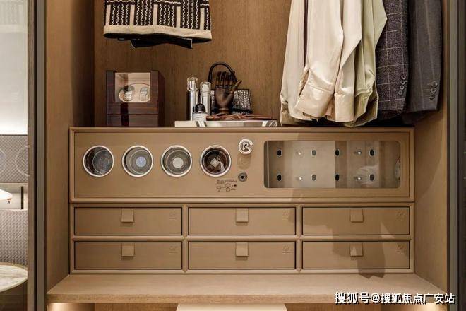 与柜体同色系的皮革抽搭配摇表器,使得柜内空间尽显高级,彰显业主奢华的生活品质和独有姿态。