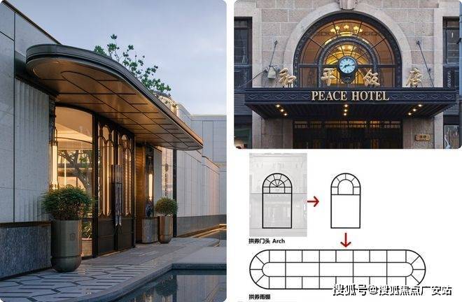 吊顶雨棚纹样,来源于上海和平饭店主入口花窗,设计选取其主入口的花窗作为纹样的源头,通过抽象化的艺术处理手法,将经典元素融入现代设计之中,赋予新建筑以深厚的历史底蕴,对海派文化及其象征性符号表达传承与致敬。