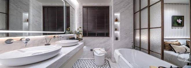 卫生间墙面采用大面积岩板,台盆柜处定制镀金龙头;另外超大镜面柜内配置了充电口,方便剃须刀、电动牙刷等工具收纳。