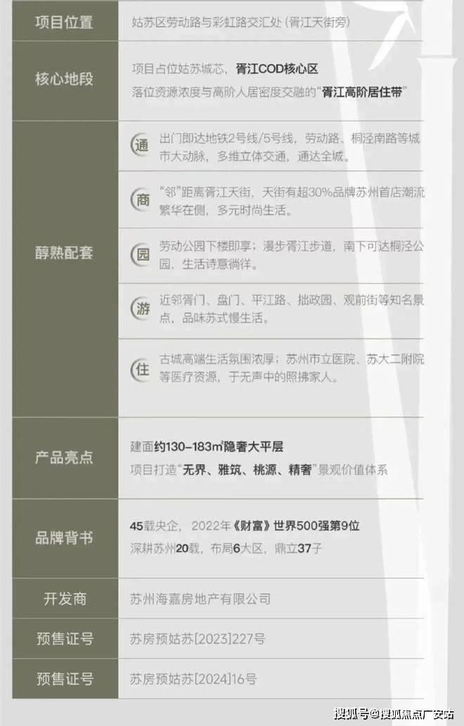 开发商:中海地产(苏州海嘉房地产有限公司),央企背景,苏州已开发36个项目(如胥江府);