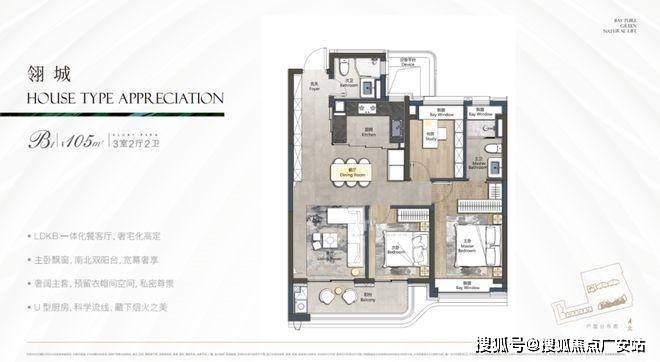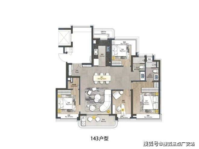 四开间朝南的设计+六飘窗(北次卧约270°转角飘窗)+宽面阳台,整个户型的采光通透度真的做到了完美。