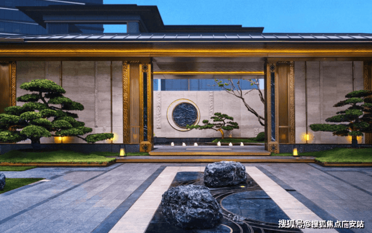 月影江南灵韵入境:入户两侧水景清泉涌动,婉转迂回,一座精致的宋风美学馆展示在眼前。透过门框衬映出满月景墙,甄选名贵奢石,在虚实掩映间延续着东方诗意山水的写意画卷。