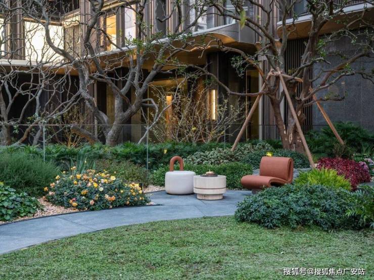而在3、5号楼之间,则搭建了【围炉夜话】场景空间。古木纹奢石砌成的火炉旁,整木炭化石凳散发着山林野趣,一株红舞姬枫树翩然伴舞。冬日傍晚,好友围坐,体会名门温情。