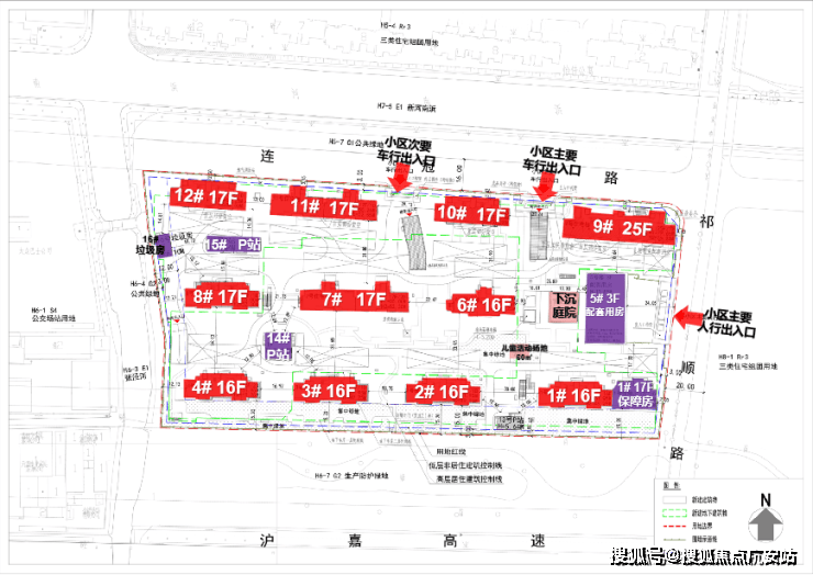 其中1号楼靠近17层的保障房,5号口为3层的配套用房;14#、15#为P站,16#为垃圾用房。