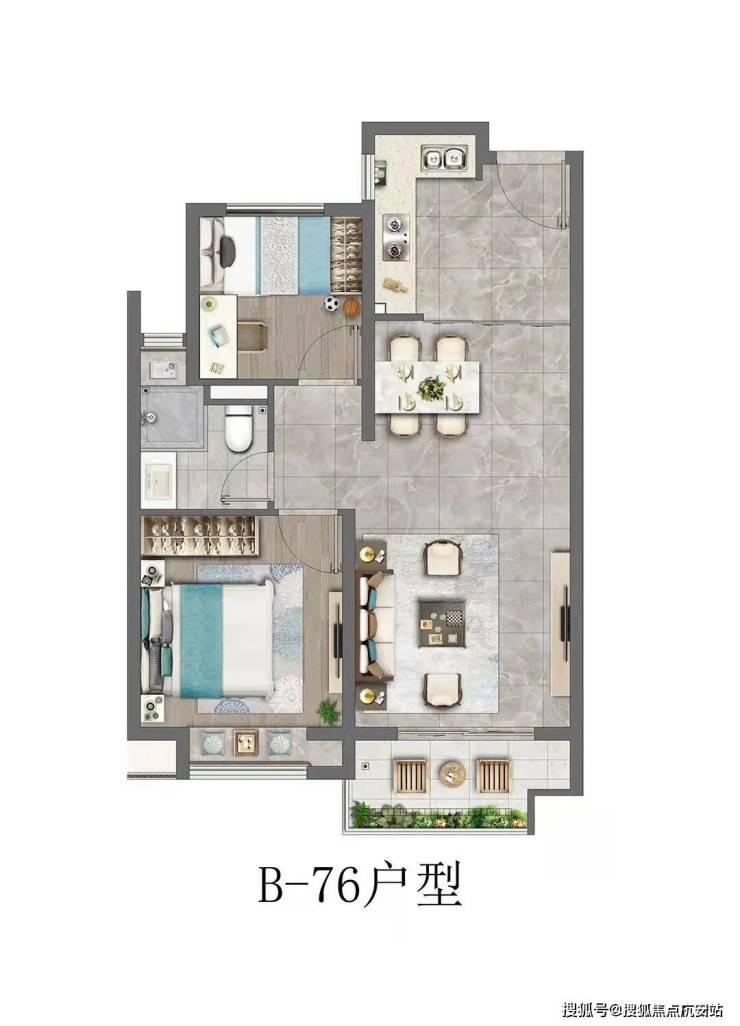 建筑面积约76㎡的两房户型,户型相当方正,也没有多余的走廊等空间浪费;客餐厨一体化设计,让视野非常的开阔;同时,双开间朝南的设计,保证了室内采光、通风的优秀。