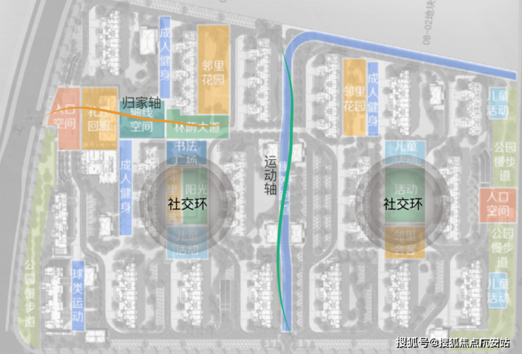 运动轴-中央康养跑道,200米南北景观中轴,形成社区活力之源;社交环-社区中央会客厅,邻里花园、阳光草坪、儿童活动区、书法广场,聚合社交共融生活环;三组团-邻里花园+成人健身双组团,球类运动竞技组团。