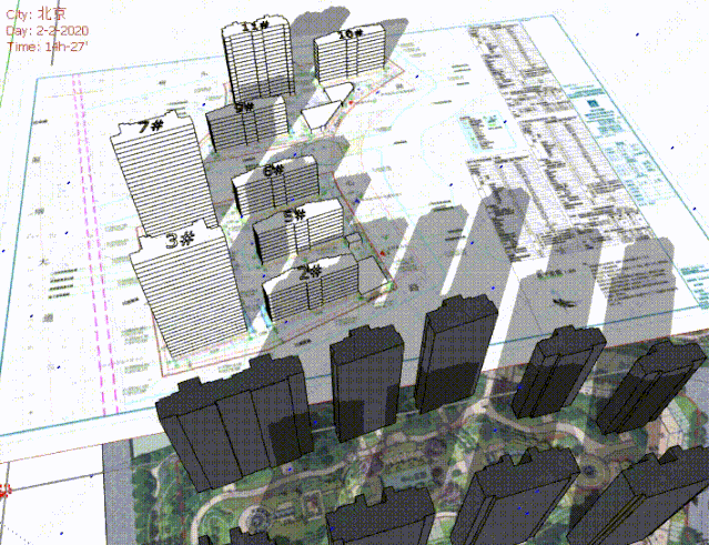 非常幸运我们拿到了南侧安置房的总平。有了相对精准日照依据后,小虎重新做了一遍模拟,可以看到对本期一期开盘楼栋基本没影响。