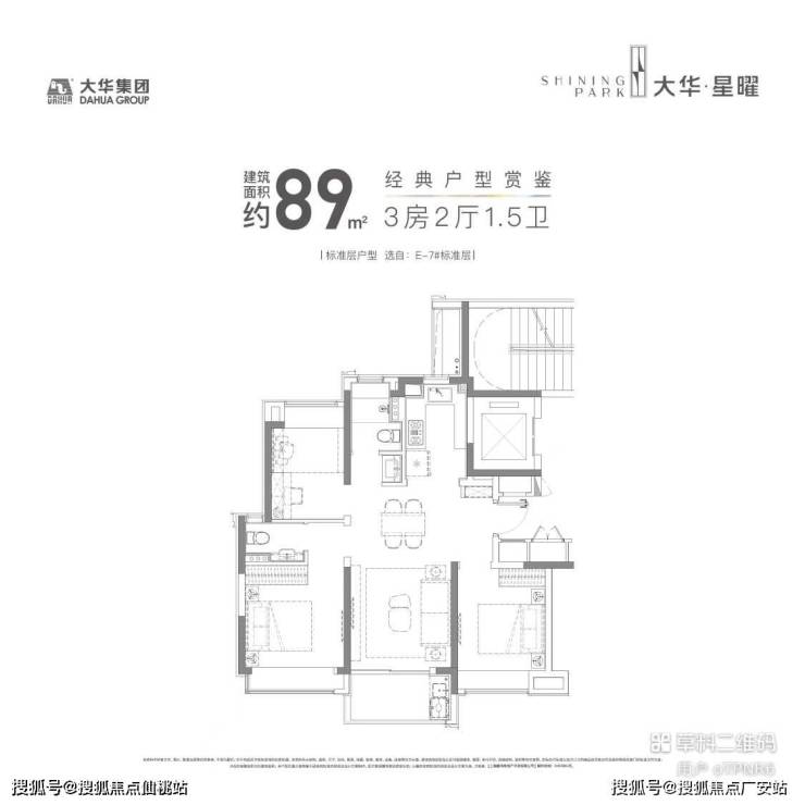 大华星耀89㎡户型,三开间朝南,并且全卧室带飘窗,室内的采光、视野以及空间延展性都非常出色。值得一提的是,室内没有任何的走廊和拐角,在加上一梯两户带来的高得房率。所以虽然是约89㎡的紧凑型3房,但这个户型还是有空间做了一个1.5卫的设计,保证了主人的私密空间,也避免了早高峰用厕的尴尬。