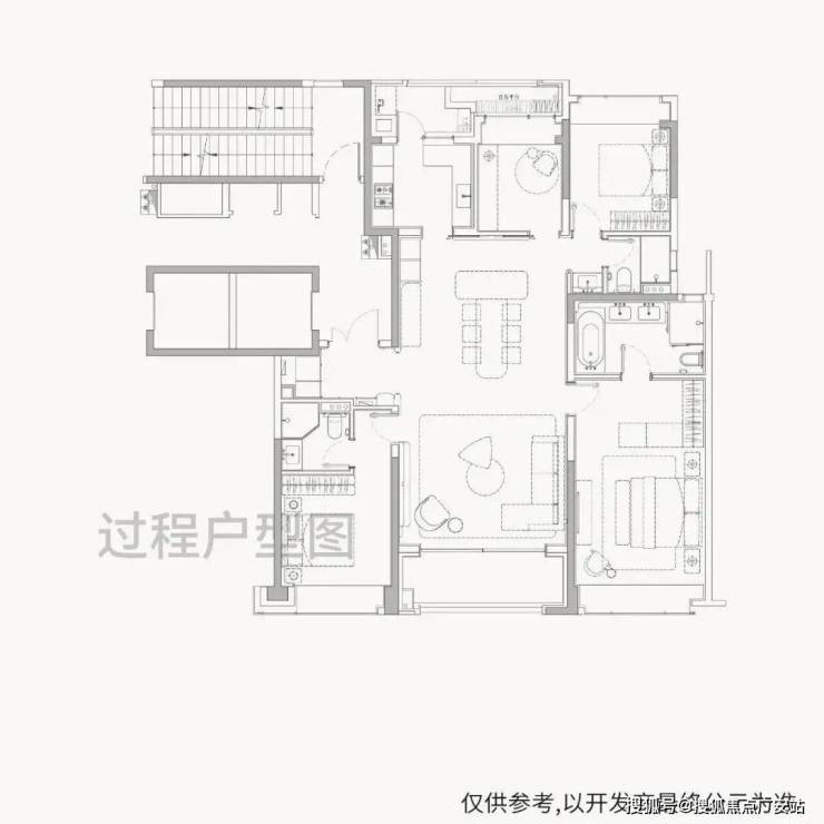215㎡的纵置核心筒户型,与横置核心筒相比,整体布局更加紧凑,但功能分区同样出色。
