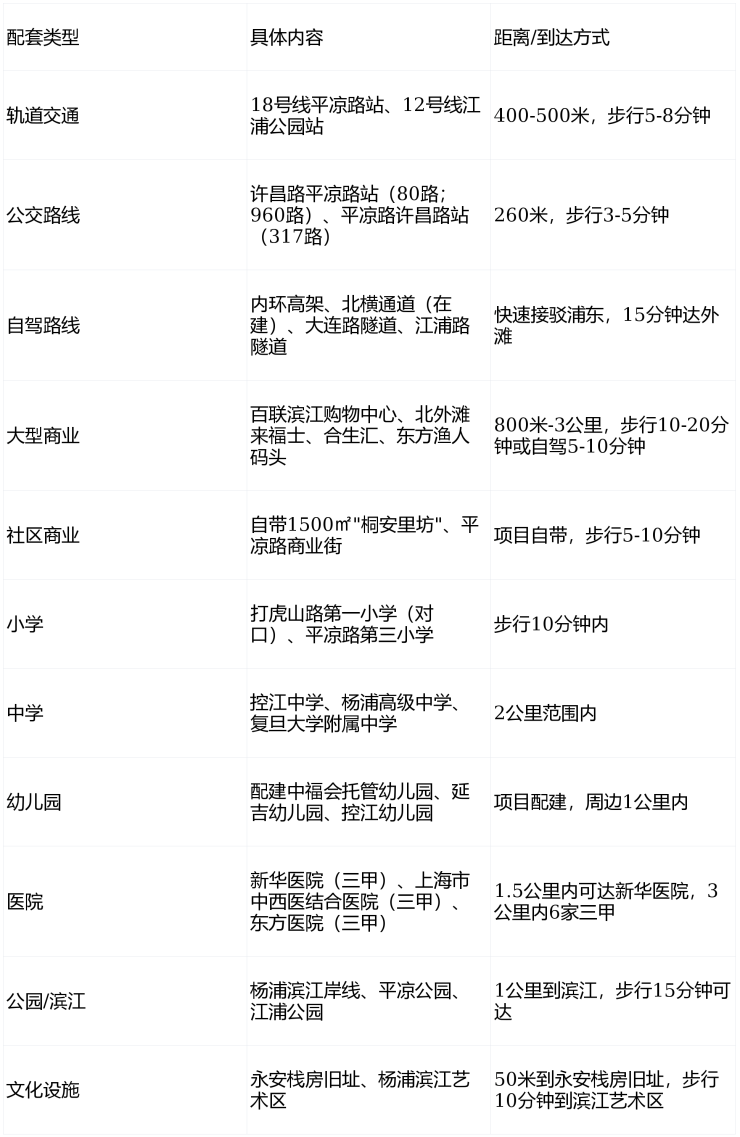 商业配套多元:800米到百联滨江购物中心,1公里到平凉路商业街,3公里内覆盖北外滩来福士、合生汇、东方渔人码头等高端商圈