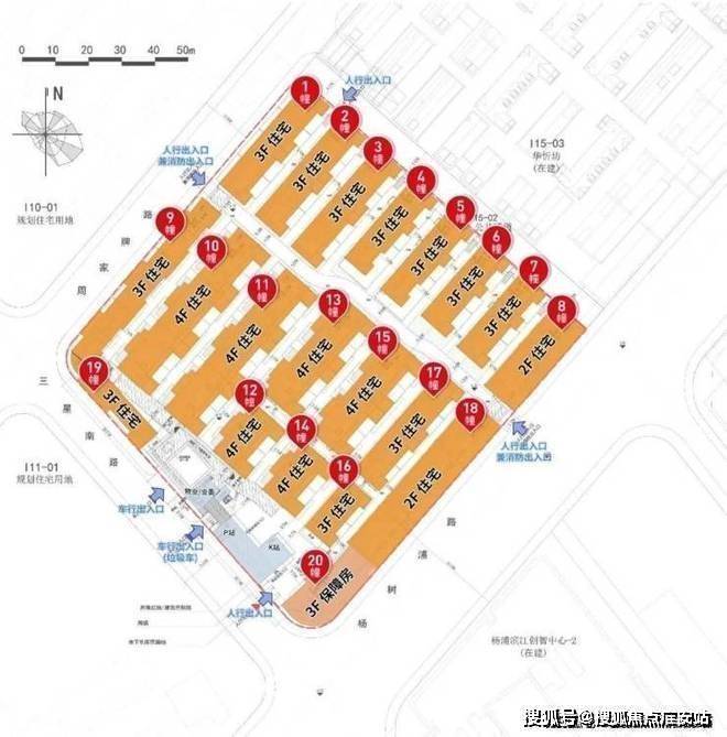 根据项目规划设计方案,地块拟建6栋4F叠墅、13栋2-3F合院,以及1栋3F保障