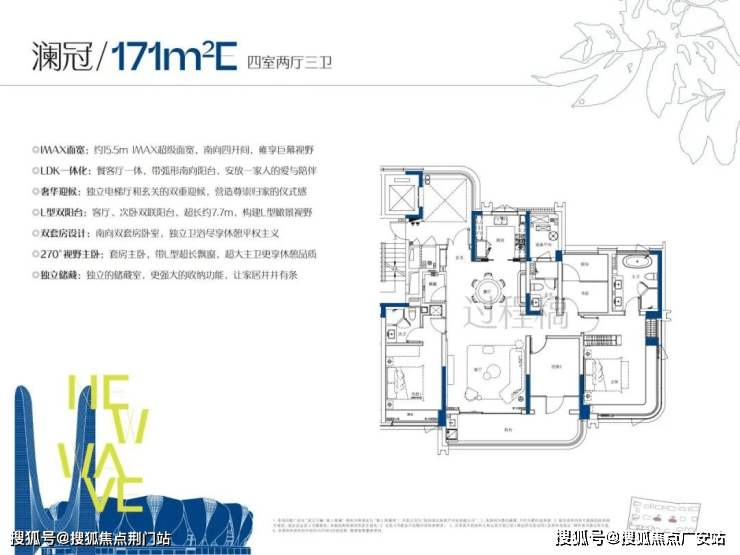 约171㎡大四房:三卫双套房,南向面宽约15.5米,主卧带L型转角飘窗,总价约700万实现终极改善。