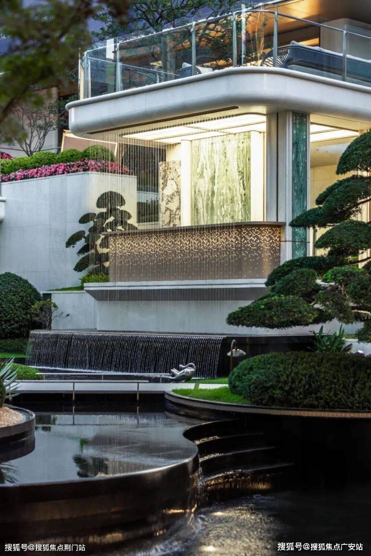 如果近距离看,项目的入口细节之处又不是奢华,尤其是大面积的奢石运用(梵高白奢石+古驰黑石材),绝对是大手笔,再搭配四根梵高白立柱托起古铜色铝板,层层抬升,豪宅大院的气质扑面而来。