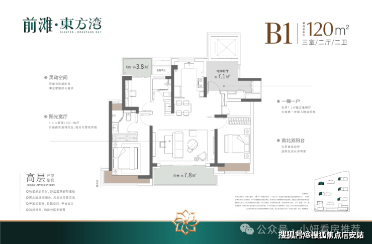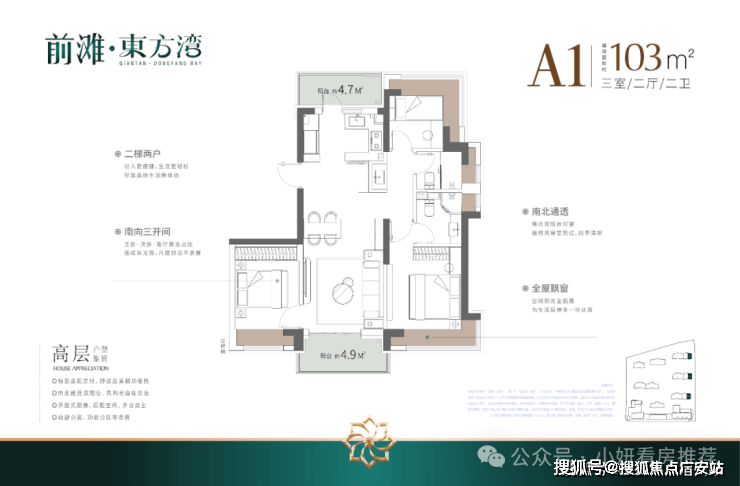 户型建筑层高3.1-3.15米,无连廊,双阳台配置。其中建面约103平户型2梯2户,其余一梯一户。