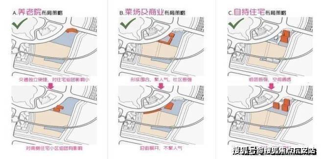 首先锁定北侧公区区域,探索养老院、菜场、商业及自持住宅的布局策略。