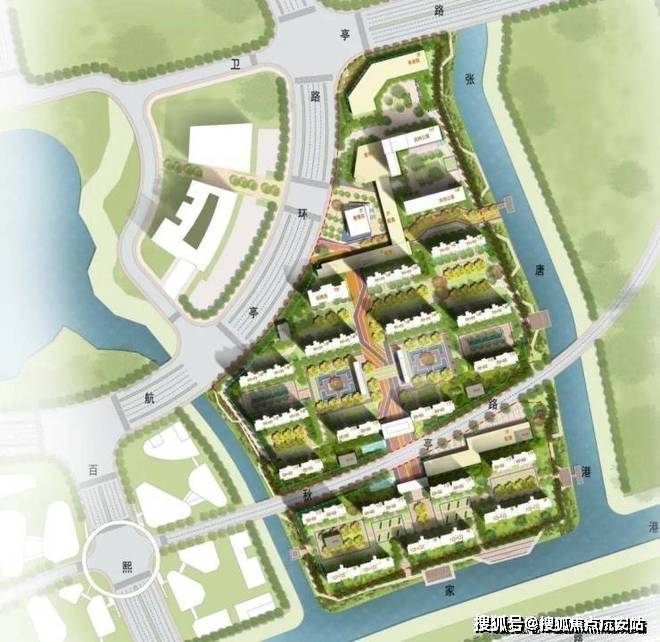 开放共享轴链接各个节点:生态运动休闲带,生态林荫大道,街区绿地;形成连续的绿色公共、半公共空间。并在绿地中注入国际文化特点的商业配套,形成尺度宜人的街道和建筑尺度。