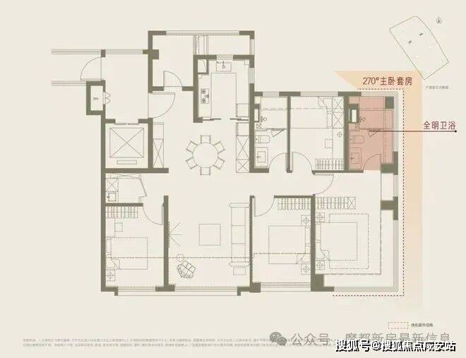 主卧270度飘窗+主卫三飘窗的设计(常规项目不具备),形成“全景舱”般的视野。