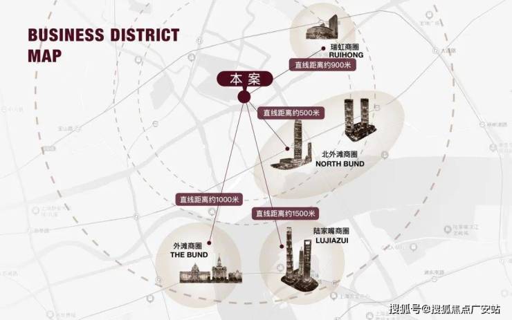 越秀外滩樾直线距离外滩源仅约1.2公里,直线距离北外滩商圈约500米,直线距离瑞虹商圈约900米,直线距离陆家嘴商圈约1500米!