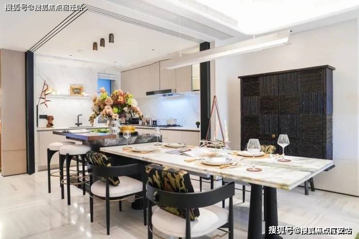 餐厅内设有尺寸大约为1.2米乘以1.5米的岛台,采用天然奢石威尼斯棕材质,这同样是交付标准!