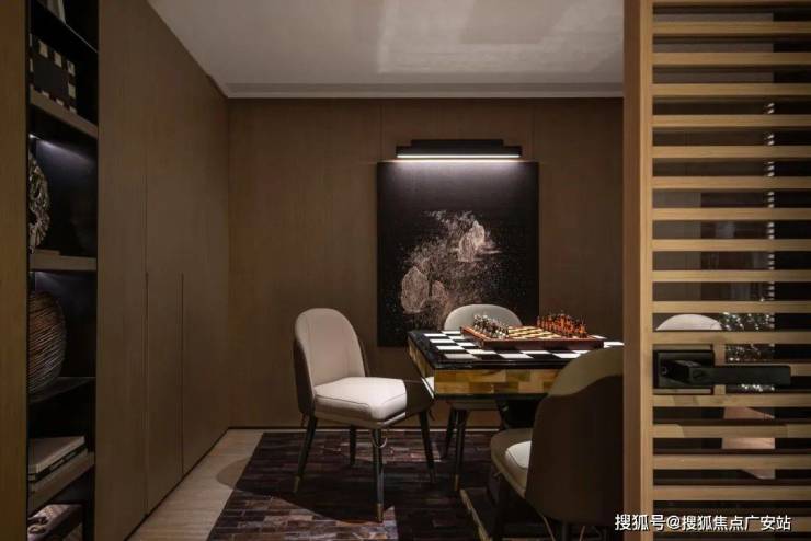 书架以及空间中预先设定的轮廓线条,精准地勾勒出隔而不断的空间形态。书架仿佛具有神奇的魔力,打破了空间的界限,将会客区、餐厅、书房与文化韵味巧妙融合,每个区域既相互关联,又有着各自独特的层次,形成了一种和谐而又富有变化的空间秩序。