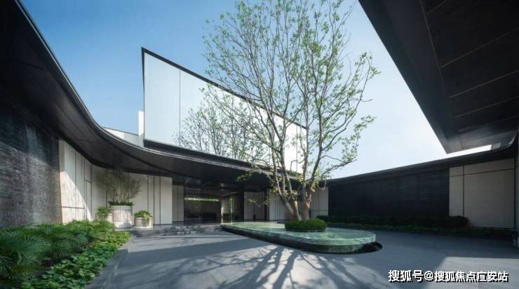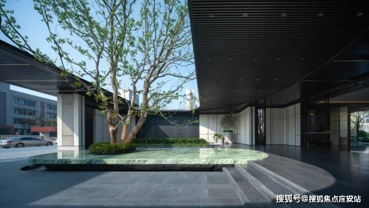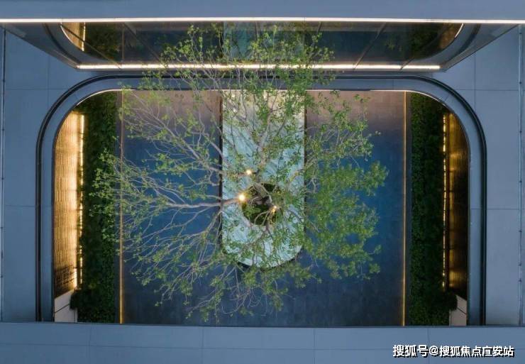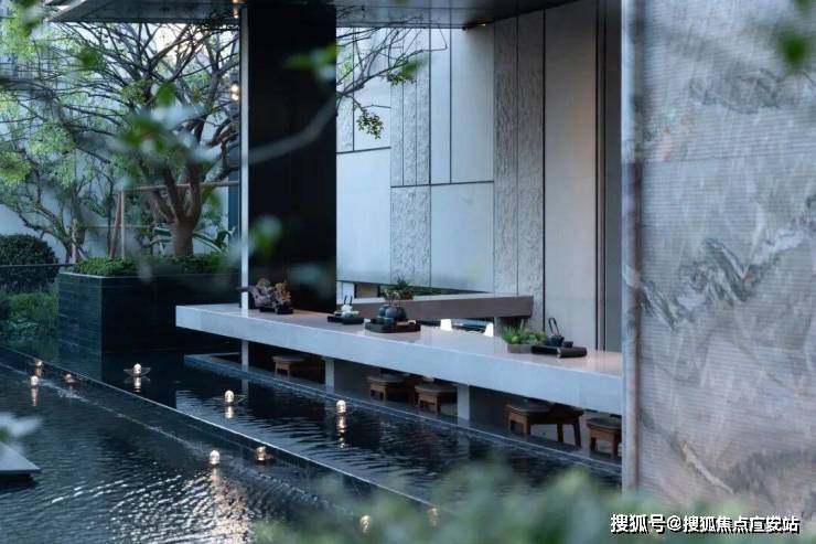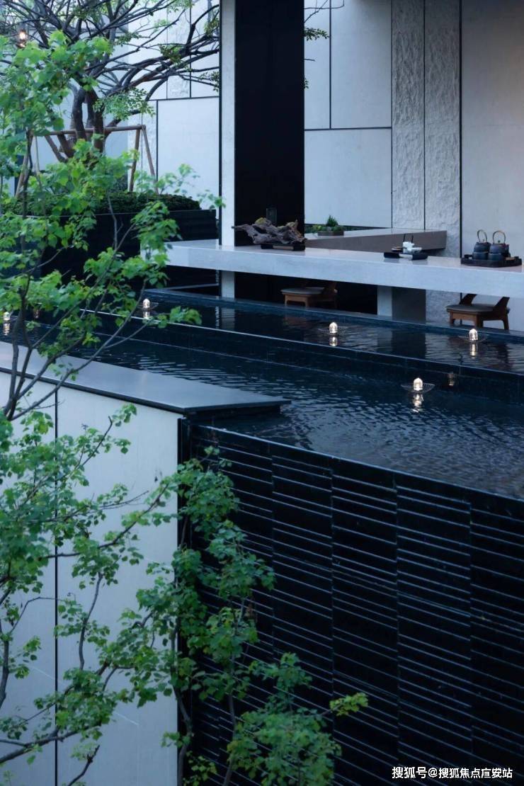 水中的观景会客厅,紫气东来大理石水幕景墙与下沉庭院的水幕墙上下联动,形成立体的山水体验。杂木林掩映观萃会客厅,可洽谈会客,可冥想深思,可松弛度假。