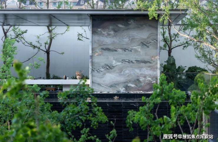 将紫气东来(奢石)运用到水幕景墙上,赋予了整个空间的隐逸高级的诗意,质朴中的奢华