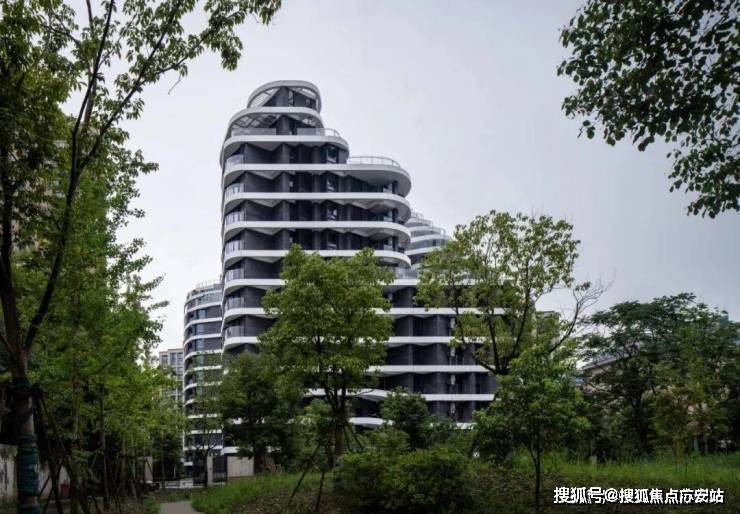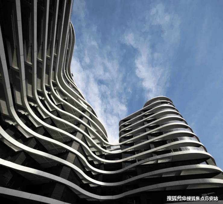 项目外立面采用玻璃幕墙现代简约风。建筑轮廓曲线蜿蜒,呈波浪线型层层迭高并后退,时尚感非常强。