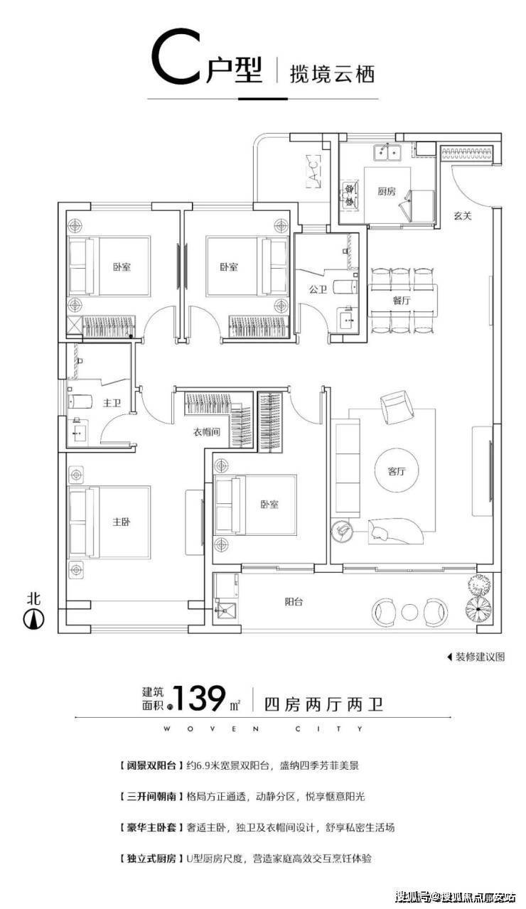 139方四房两厅两卫边套户型,共3个面积段4种户型,可根据自身居住需求选择。