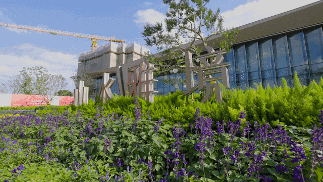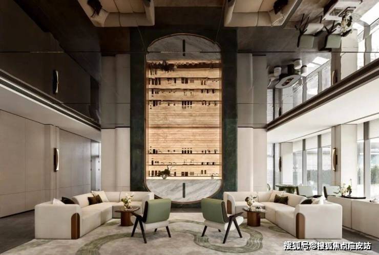 再仔细看,建筑主体采用银灰色、灰色等颜色的金属铝板,以及一体板等不同材料,质感高级;底部采用石材、香槟金色铝板以及绿色奢石点缀,细节到位;顶部灵动飘逸的飞檐塔冠,具有辨识度。