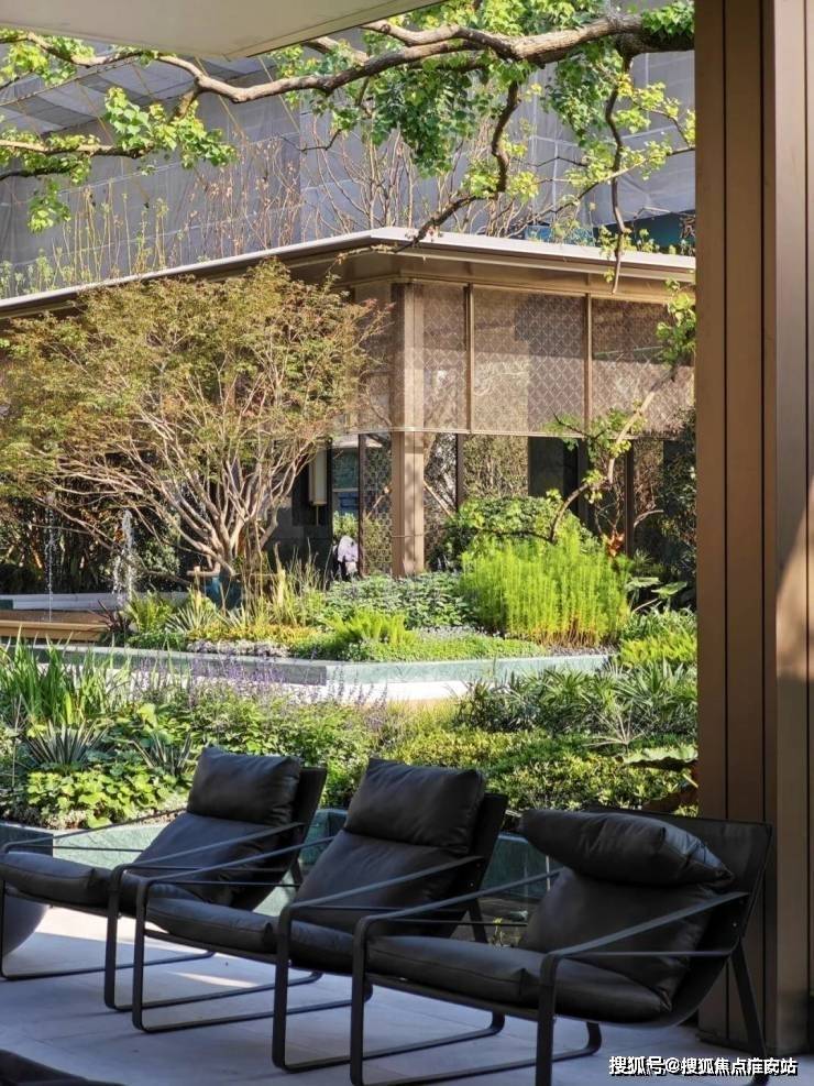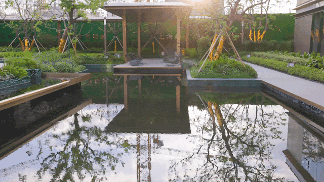 从售楼处进门后,是一座林下会客区,仪式感十足!其结合归家游园的仪式绿轴与艺术会客水庭,将中心景观打造多功能复合场地。