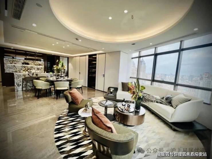 客厅270°采光面,配置弧形沙发,窗前可见上海经典三件套;