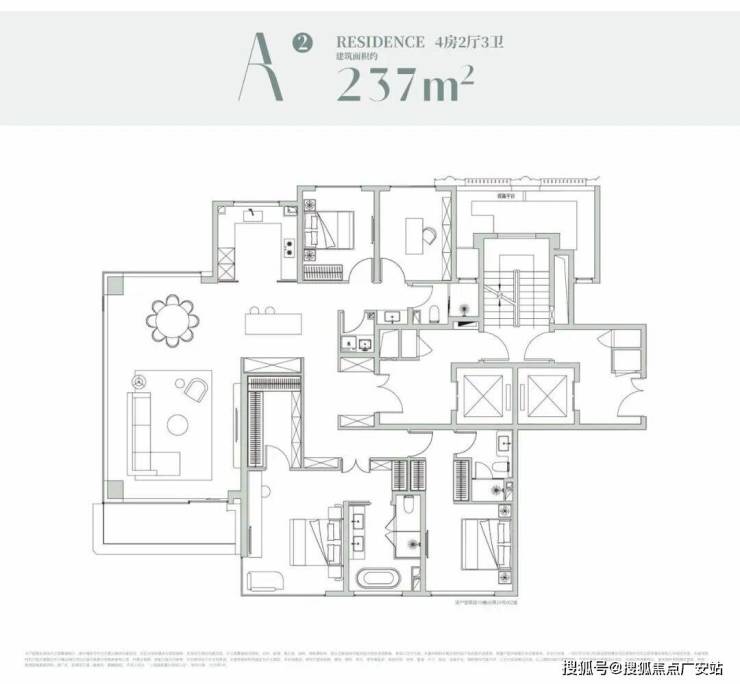 经典的四叶草布局,四开间分布在四角,兼顾私密与互动,是二胎家庭的优选。